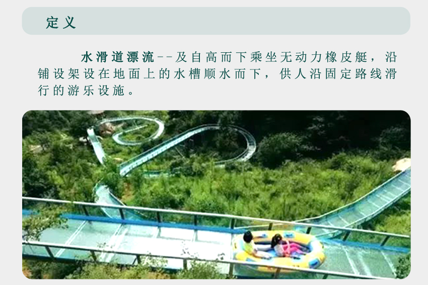 一是,依據大型生態漂流的體驗感,設計優化升級而來。依地勢修建漂流槽,槽內水深約20公分,水在漂流槽中托船順流而下,速度可控,刺激與安全兼得,確保百分之三百的安全。在設計上我們可以做到游客在漂流過程中基本不濕衣物。我們暫且稱這種形式的漂流為水滑道漂流